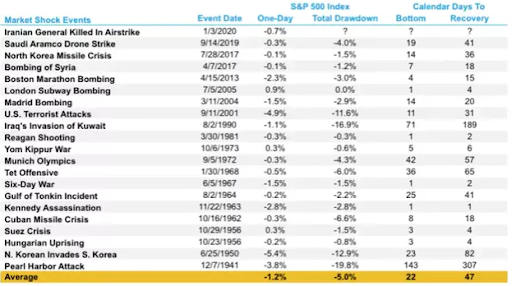 It is important to appreciate that technology and human nature has changed since the Earth’s last major conflict in WWII. A 2020 research note by LPL Financial found that stocks are ignoring geopolitical risk and bouncing back from these events at a faster pace than ever. In their review of 20 major geopolitical events, the avg. drawdown in markets was 5% and these losses were recovered within an avg. 47 trading days. However, if you exclude WWII from the data, the avg. drawdown is 4.2% and this is recovered in 33 trading days.