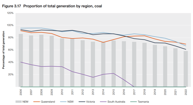 Australia is still a nation that runs on coal, evidenced by the “State of the Energy Market 2023” report that shows coal accounting for almost 60% of total generation in the National Energy Market (NEM). While coal’s use is declining, the decline comes in waves as individual generators shut down. For example, the chart below shows South Australia’s coal generation quickly falling from 21% to zero between 2015 and 2017 as the state closed its last two coal stations - Northern and Playford B.